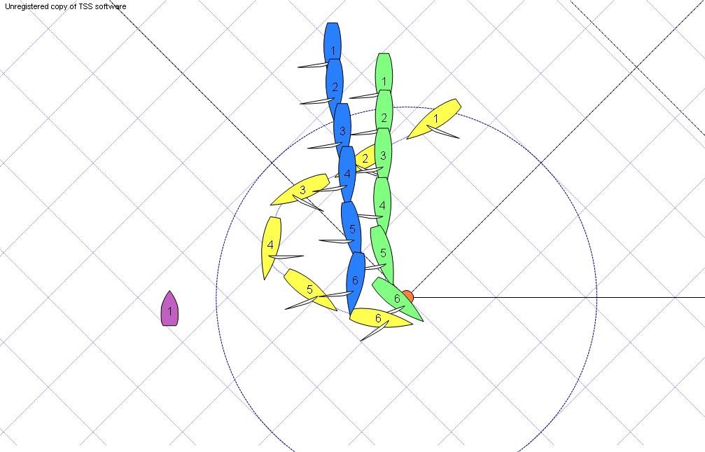 Dal momento che giallo entra nella zona, scatta la 18.2b: verde e blu devono dare spazio alla boa a giallo, cosa che non fanno, provando a passare interni, a loro rischio e pericolo, e quando giallo va a prendersi il suo sacrosanto spazio, infrangono la 18.2b. In più verde infrange anche la 31 e si autopenalizza, e blu infrange anche la 12. Squalificate entrambe. Qui siamo in regata di flotta, ma in match race, la manovra di giallo è una classica trappola per una barca con diritto a spazio e di rotta, tesa per far prendere all'avversario, per lo più una doppia penalità. |